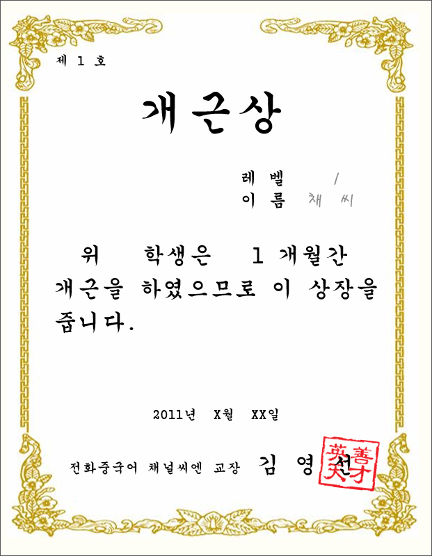 di******** 개근상도 받고 중국어 실력도 향상되고 一举两得! (2017.05.18 07:44) 리플달기