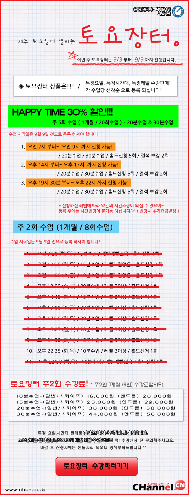 he****** 오후 21:05 화 목 15분 수업 신청합니다.(프리토킹) - 카드결제 完 (9월 8일 첫 수업) (2011.09.06 17:25) 리플달기