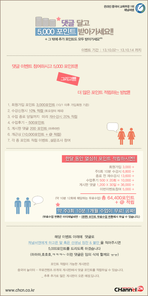 we***** 채널씨엔을 시작한지도 만 2년이 되어가네요, 고급반으로 시작해서 많은 선생님들이 가르쳐주셨지만 free talking을 하더라도 꼼꼼하게 성조, 발음 교정해주셔서 정말 좋아요. 포인트도 중요하지만 이런 이벤트를 통해서 중국어 공부에 조금이라도 더 참여할 수 있게되서 좋네요. 앞으로도 많은 활동 부탁드립니다. (2013.10.04 13:43) 리플달기