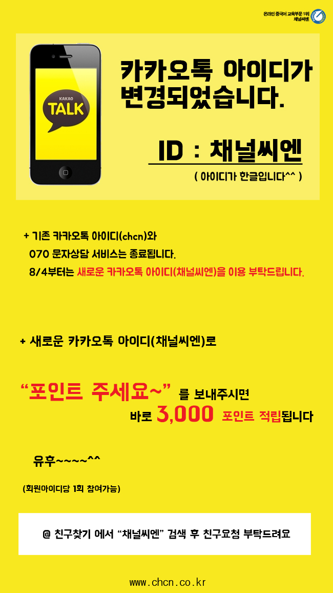 ad*** 8월4일 부터는 예전 카카오톡 아이디(chcn) 및 070 문자 상담은 종료 됩니다, 꼭 새로운 아이디(채널씨엔)으로 추가 부탁드립니다^^ (2015.08.03 20:11) 리플달기