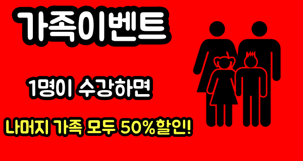 # 가족이벤트 가족모두 같은날 수강신청하셔야됩니다, 단 수업시작일은 원하시는 날짜로 설정 가능합니다.